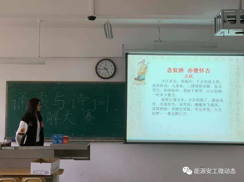 其次是孙晔同学讲解的《念奴娇·赤壁怀古》,激情澎湃,情感丰富,讲出了“古今绝唱”的雄浑苍凉,大气磅礴,笔力遒劲,境界宏阔,给人以撼魂荡魄的艺术力量。孙晔同学细致的讲解,让我们知道,“千古风流人物”抒发了词人对昔日英雄人物的无限怀念和敬仰之情以及词人对自己坎坷人生的感慨之情。“人生如梦”,抑郁沉挫地表达了词人对怀才不遇的无限感慨。“一樽还酹江月”,借酒抒情,思接古今,感情沉郁,是全词余音袅袅的尾声。诗人是个旷达之人,尽管政治上失意,却从未对生活失去信心。诗人的这种复杂心情被孙晔同学反映的淋漓尽致,虽然书写失意,然而格调是豪壮的,跟失意文人的同主题作品显然不同。长江的非凡气象,古战场的险要形势都给人以豪壮之感。周瑜的英姿与功业无不让人艳羡。