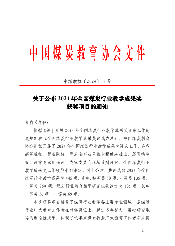 9月10日,中国煤炭教育协会下发了《关于公布2024年全国煤炭行业教学成果奖获奖项目的通知》(中煤教协【2024】18号)文件,安全工程系教师赵国飞、于丽雅、卢国菊、刘慧敏、马冬娟、王小丽、李鹏、王永安披荆斩棘,表现卓越,经过层层选拔荣获2024年全国煤炭行业教学成果二等奖。