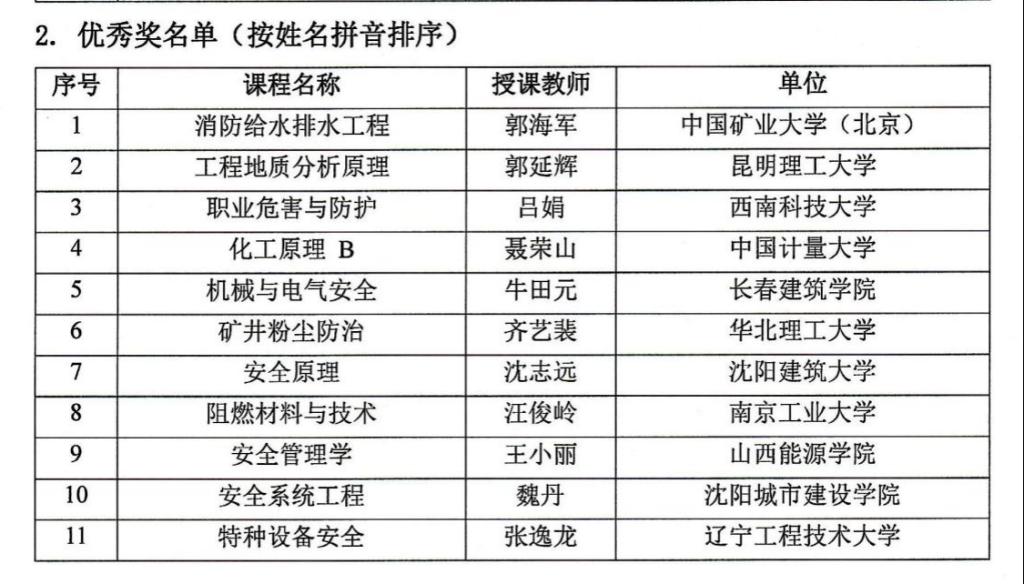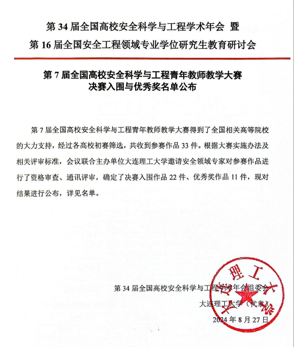 全国高校安全科学与工程青年教师教学大赛是由教育部安全科学与工程类专业教学指导委员会、公共安全科学技术学会、全国高校安全科学与工程学术委员会、中国职业安全健康协会联合主办,是目前我国安全科学与工程领域具有影响力的综合性、高水平教学交流平台。