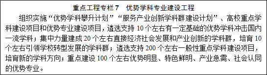 提升学科专业建设水平。引导高校围绕办学定位和服务全省社会需求,科学制定学科发展规划和专业建设规划,不断优化学科专业结构,全面提升服务能力,重点支持与高端装备制造、新能源、现代煤化工、新材料、节能环保、食品医药、现代农业、现代服务业等新兴产业和传统产业改造提升相关的100个学科专业建设。建立学科专业人才需求预测预警系统,制定完善学科专业设置、建设与评估标准体系,建立健全高校毕业生就业和重点产业人才供需年度报告制度,完善学科专业动态调整机制。