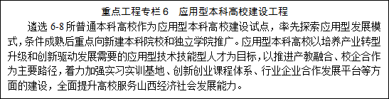 全面提高本科院校办学水平。坚持内涵发展,大力实施“1331”工程,全面提升高等教育综合实力。坚持特色发展,引导高校根据自身类型和办学定位走特色强校之路,形成满足社会多样化需求的特色发展局面。重点支持山西大学、太原理工大学按照国务院“双一流”建设精神要求率先发展,引导其它具有博士学位授予权的高校建设成为区域或行业特色鲜明的高水平大学,积极推动有条件的新建本科院校和独立学院向应用型转变。丰富共建形式,发挥共建优势,进一步提升省部、省市共建高校办学水平。积极支持空白科类本科院校建设。