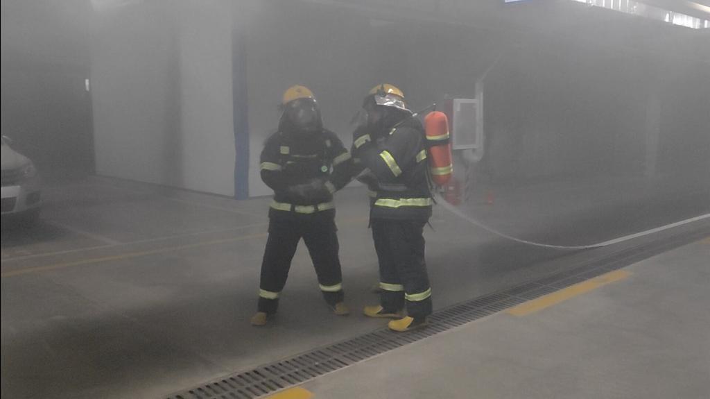 演练启动后,模拟烟雾迅速触发自动报警系统,消防控制室值班人员第一时间上报火情,应急指挥中心通过视频巡查核实火情并启动响应程序。消防设施随即联动运行:各楼层防火门自动闭合形成防火分区,电梯紧急迫降至首层,消防泵、加压送风及机械排烟系统同步高效运转。现场开展模拟人员疏散演练,疏散引导组按预定流程完成引导作业;保安应急分队闻令而动,1分钟内抵达现场,队员规范佩戴空气呼吸器,使用灭火器、消防水带精准扑救,3分钟完成初期火情处置;警戒人员快速划定安全管控范围,设置标识严防无关人员闯入,全力保障救援通道畅通。整个过程各单位配合紧密、操作规范,充分展现了过硬的应急素养与协同执行力。