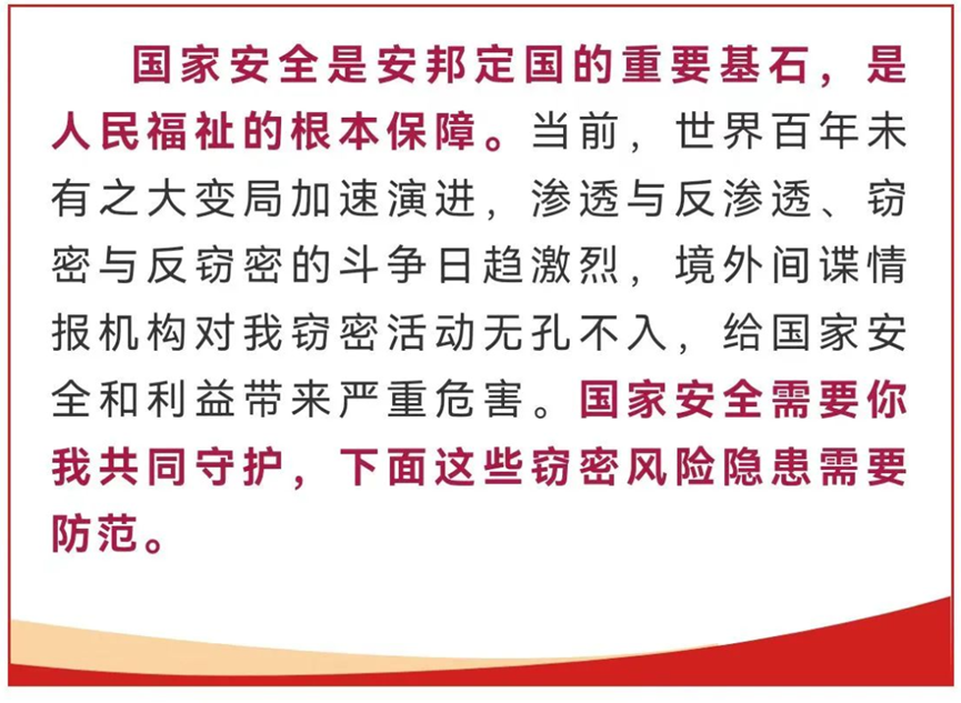 内容摘要:国家安全共同守护,这些窃密泄密风险需加防范!​