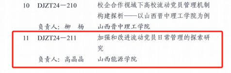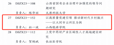 近日,山西省社会科学界联合会与山西省党建研究会联合发布2023、2024年度山西省党建研究专项课题结项评审结果。我系教师杜一波主持的《以高质量党建引领推动新时代乡村振兴——以大同市云州区为例》、高晶晶主持的《加强和改进流动性党员的日常管理的探索研究》两项课题经专家评审,均获准结项。其中,杜一波老师领衔的课题凭借深入的研究和突出的成果,在同类研究中脱颖而出,被评定为优秀课题。
