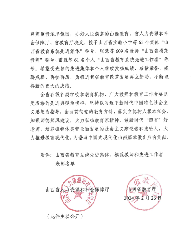 山西省教育系统先进集体、模范教师和先进工作者表彰,旨在树立典型,弘扬先进,进一步激发广大教师和教育工作者投身我省教育事业高质量发展的责任感和使命感,在全社会营造尊师重教浓厚氛围,办好人民满意的山西教育。