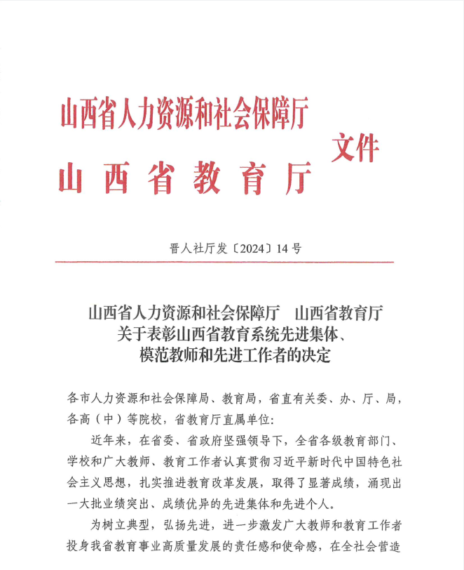 近日,山西省人力资源和社会保障厅、省教育厅下发了《关于表彰山西省教育系统先进集体、模范教师和先进工作者的决定》(晋人社厅发【2024】14号),我院地质与测绘工程系教师张明媚获得“山西省模范教师”荣誉称号。