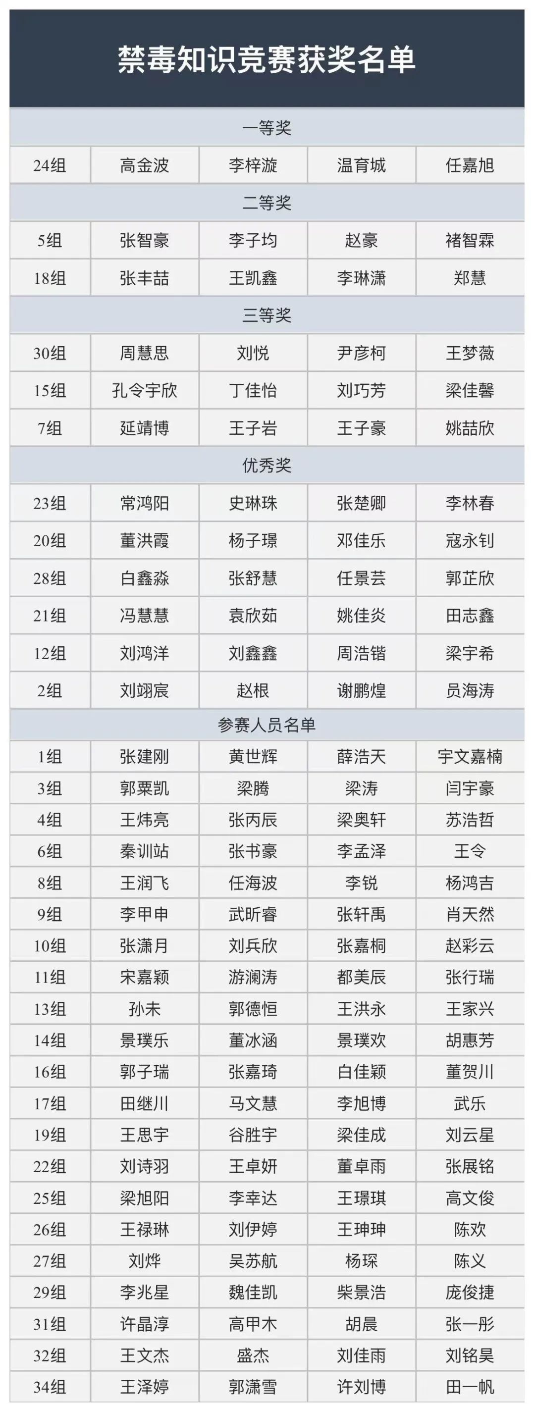 以下为本次禁毒知识竞赛获奖情况及参与人员名单。