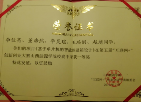 2019年5月参加第五届全国“互联网+”创新创业大赛,2019年5月底参加第五届全国“互联网+”创新创业大赛校级初赛,经过系赛,校级初赛,校级决赛,在我系老师的指导下,李佳亮团队“基于单片机的智能保温箱设计”获得校级一等奖。
