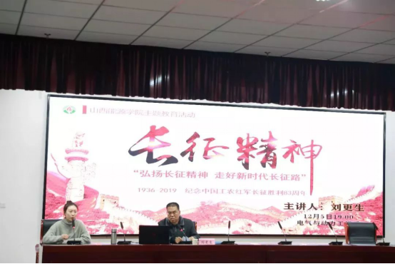 为弘扬乐于吃苦,不惧困难的革命乐观主义;勇于战斗,无坚不摧的革命英雄主义;善于团结,顾全大局的集体主义;重于求实,独立自主的创新胆略。电气与动力工程系于2019年12月5日在综合楼综三阶面向我系19级全体同学开展了有关“长征精神”的讲座。
