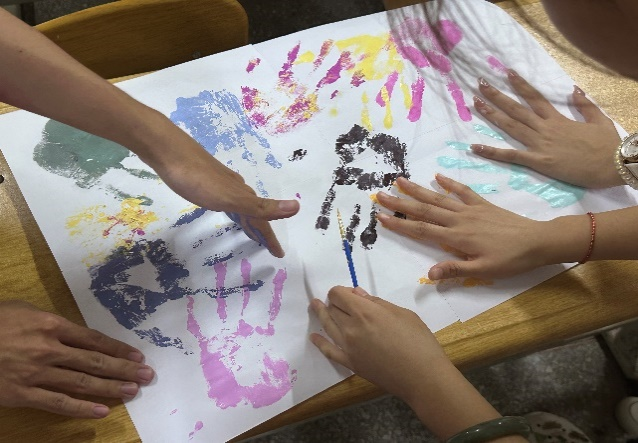 随后,同学们积极参与“共担时代使命”的活动,同学们纷纷使用颜料涂抹在手上,在白纸上印下自己的色彩。青春是一片五彩缤纷,绚烂多姿的花朵。青年人勇于承担时代赋予他们的责任与义务,他们担当责任,拥抱未来,用勇气和信念书写着奋斗的篇章。他们或许默默无闻,或许忙忙碌碌,但作为新时代青年一代,会始终坚持党的领导,“今日之责任,实则艰巨,复兴之任,重于泰山”,他们会尽自己所能,为中国建设美好。纸上的手印,是他们承诺的见证。