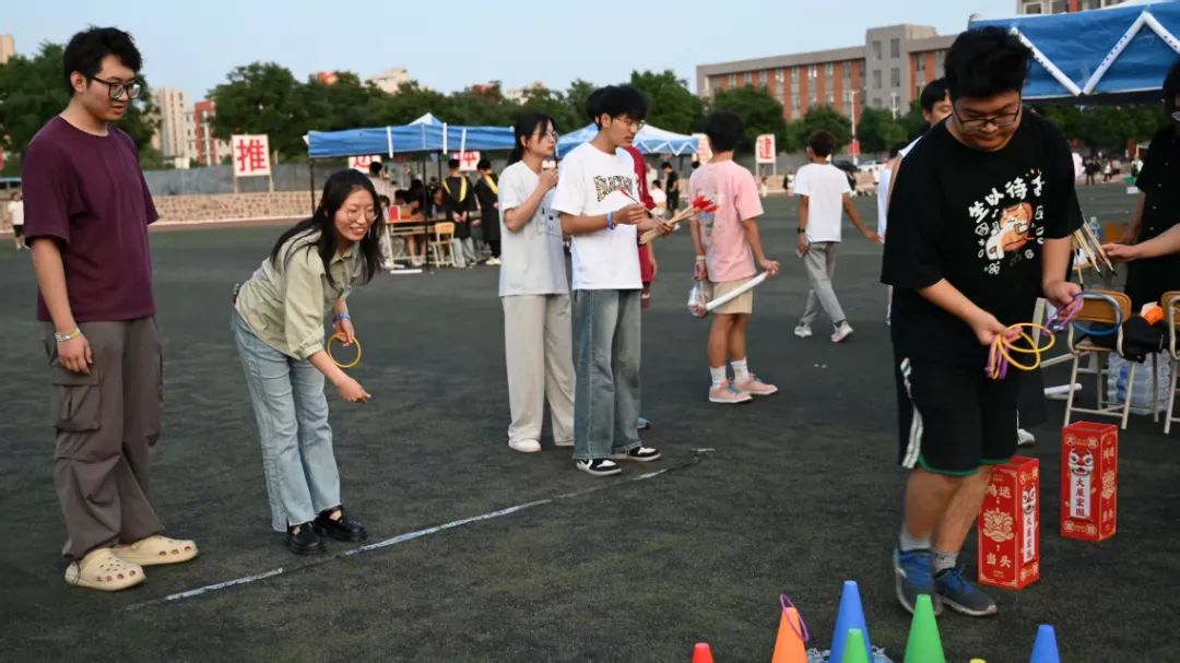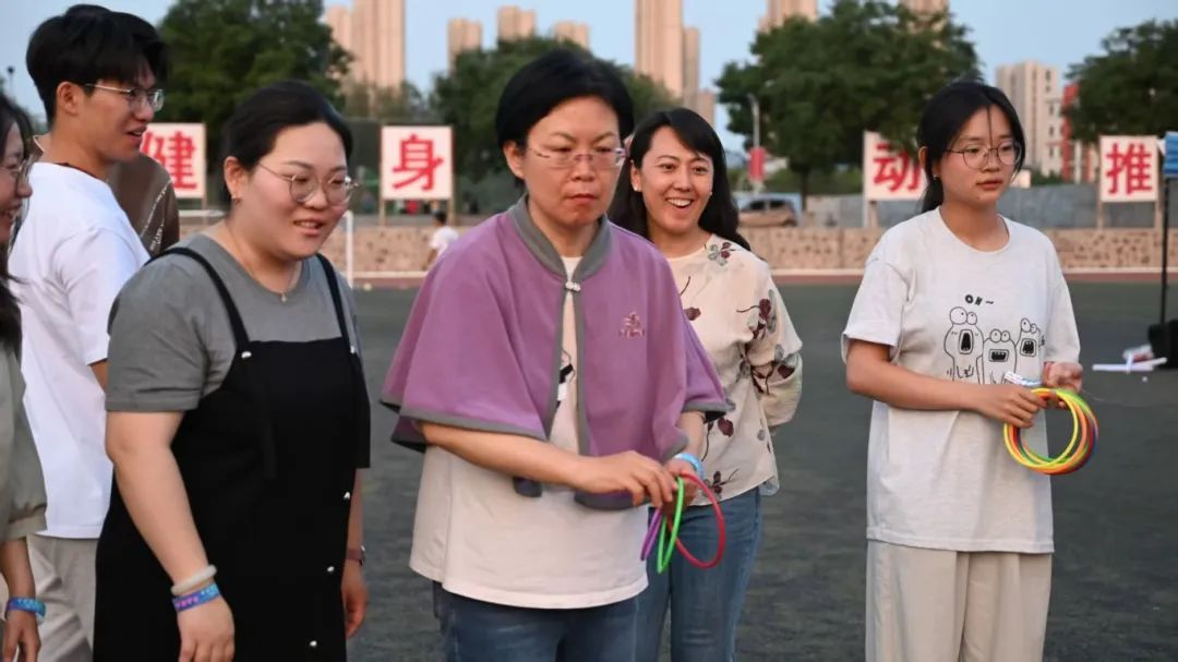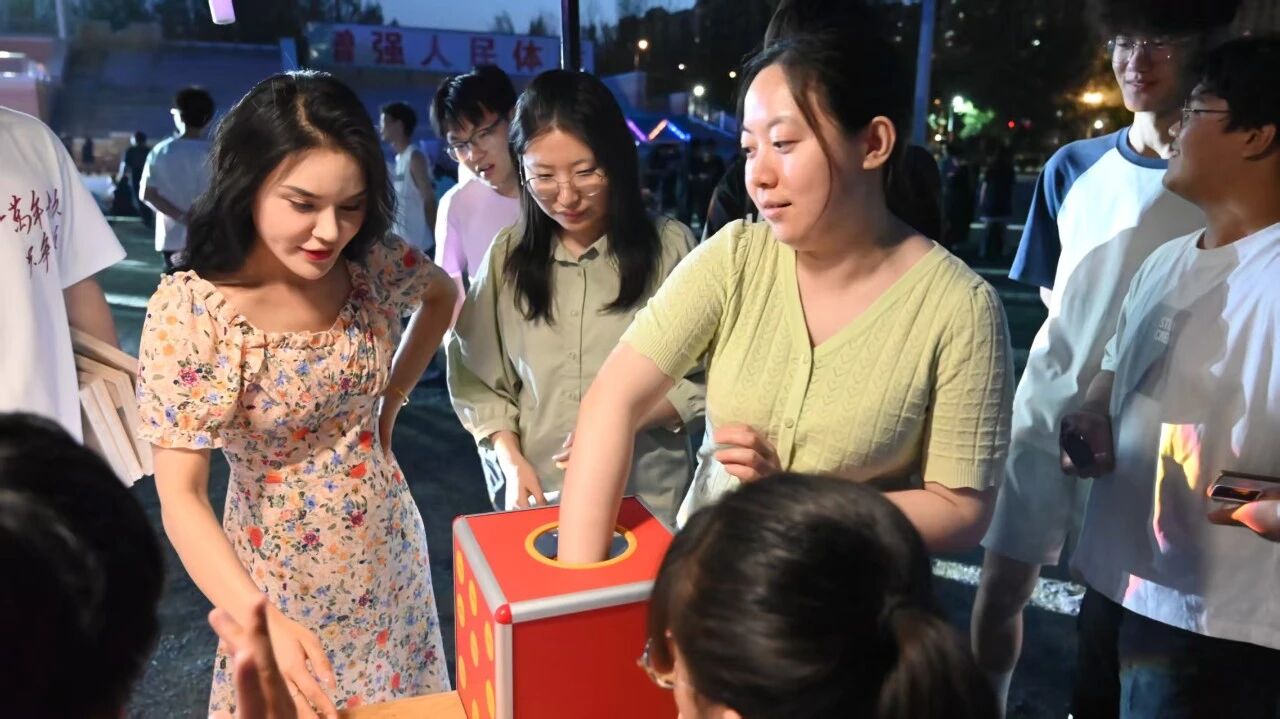 电气与控制工程系在毕业晚会设置了诸多有趣的小游戏,投壶、套圈、猜成语等,每通关一个游戏,就可以得到一个贴纸,集齐所有贴纸可以兑换精美礼品,小游戏吸引了众多学生的参与,当晚,操场上人山人海,毕业生享受着在学校的最后时光,玩游戏,看节目,回忆大学四年的美好生活,老师们也来参加游戏,欢送毕业生。