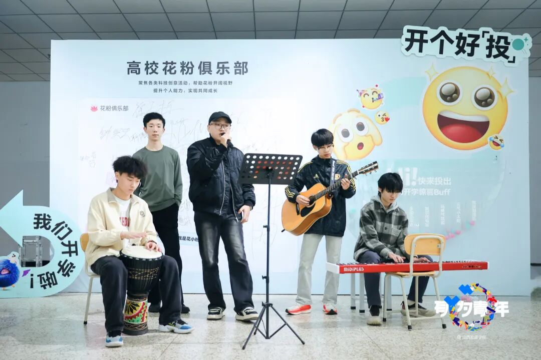 会场另一侧,音乐协会的同学们以歌声为活动助力,一首首动听曲目轮番上演,将现场氛围推向一个又一个高潮。