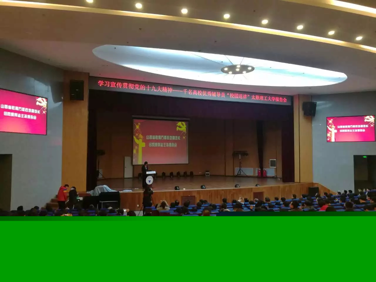2017年11月25日上午,由教育部主办的“学习宣传贯彻党的十九大精神——千名高校优秀辅导员‘校园巡讲’和‘网络巡礼’”活动走进山西。来自高校新校区10所高校的700余名师生代表齐聚太原理工大学明向校区学生活动中心报告厅,认真聆听了这堂生动的报告会。我系党支部书记刘超群,辅导员贾文娟偕同十余名学生出席了本次报告会。