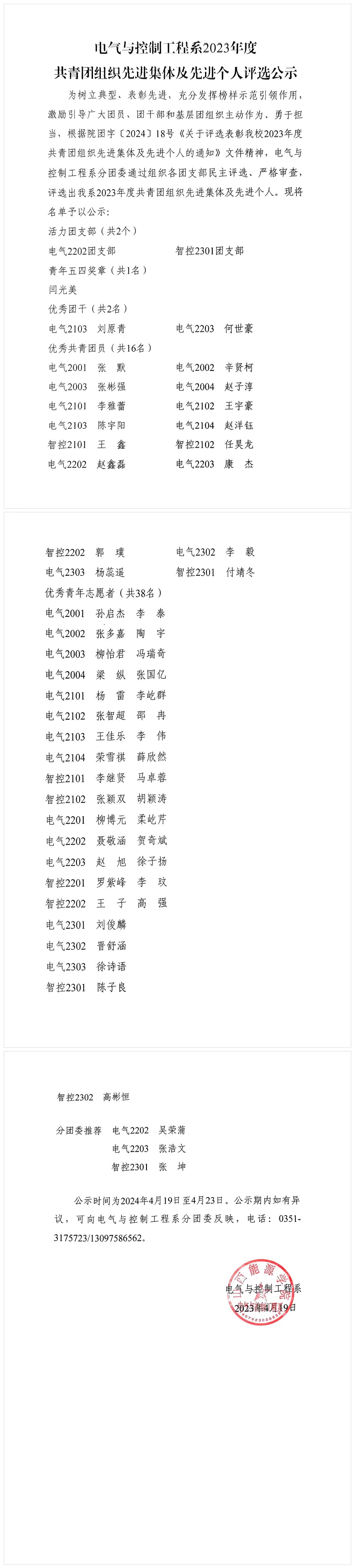 电气与控制工程系2023年度共青团组织先进集体及先进个人评选公示