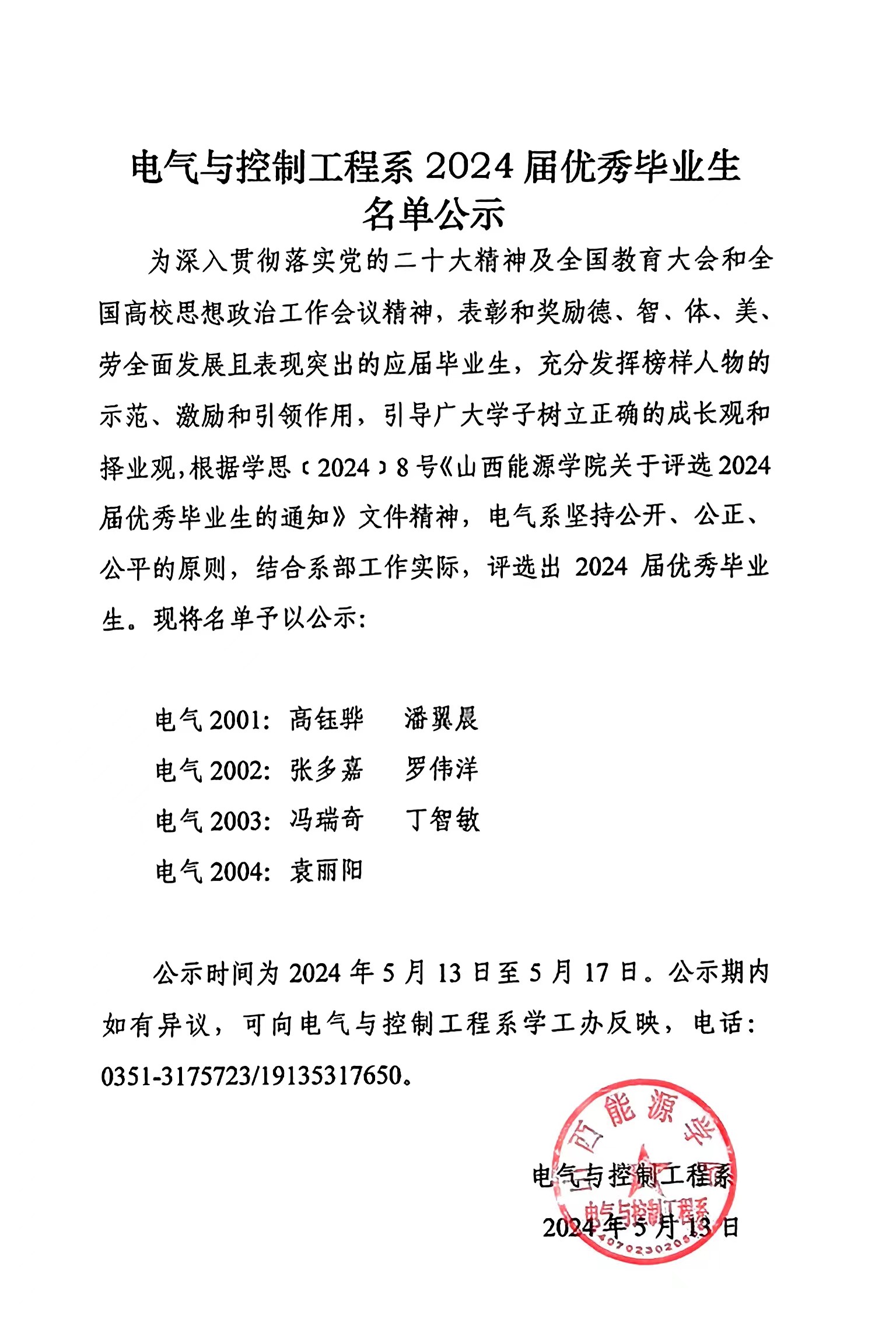 电气与控制工程系 2024届优秀毕业生名单公示