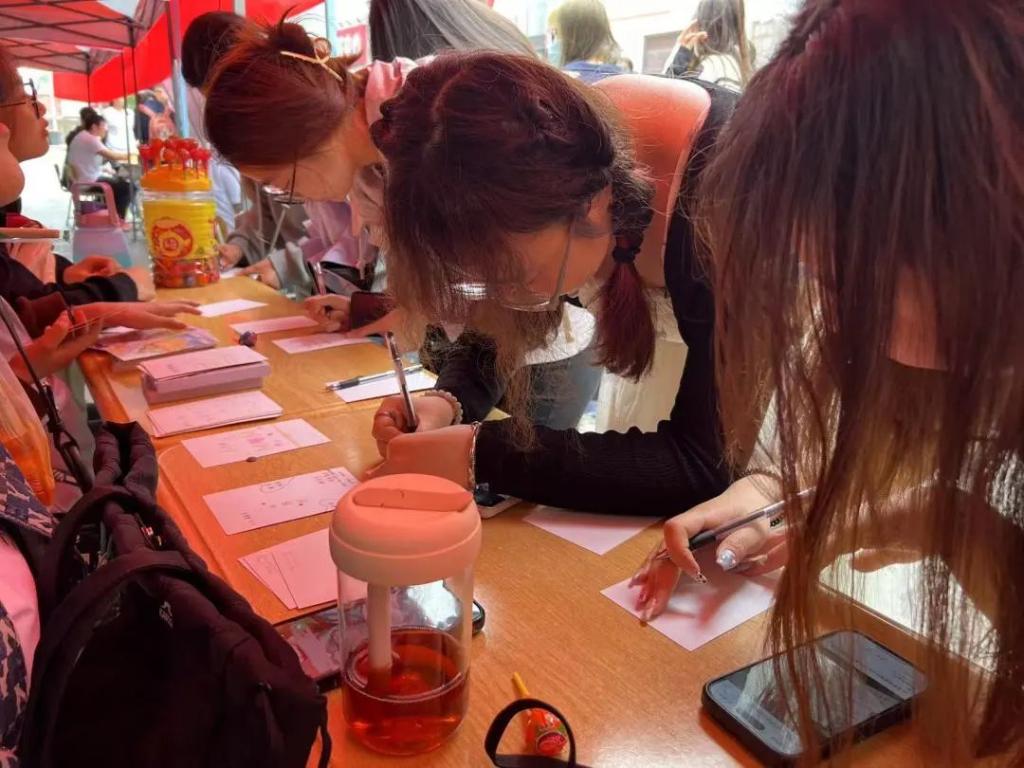 在活动现场的老师与同学们在明信片上写下自己一直想对母亲说的话,有深情的告白,也有对母亲的祝愿,还有对母亲表达的歉意等等。