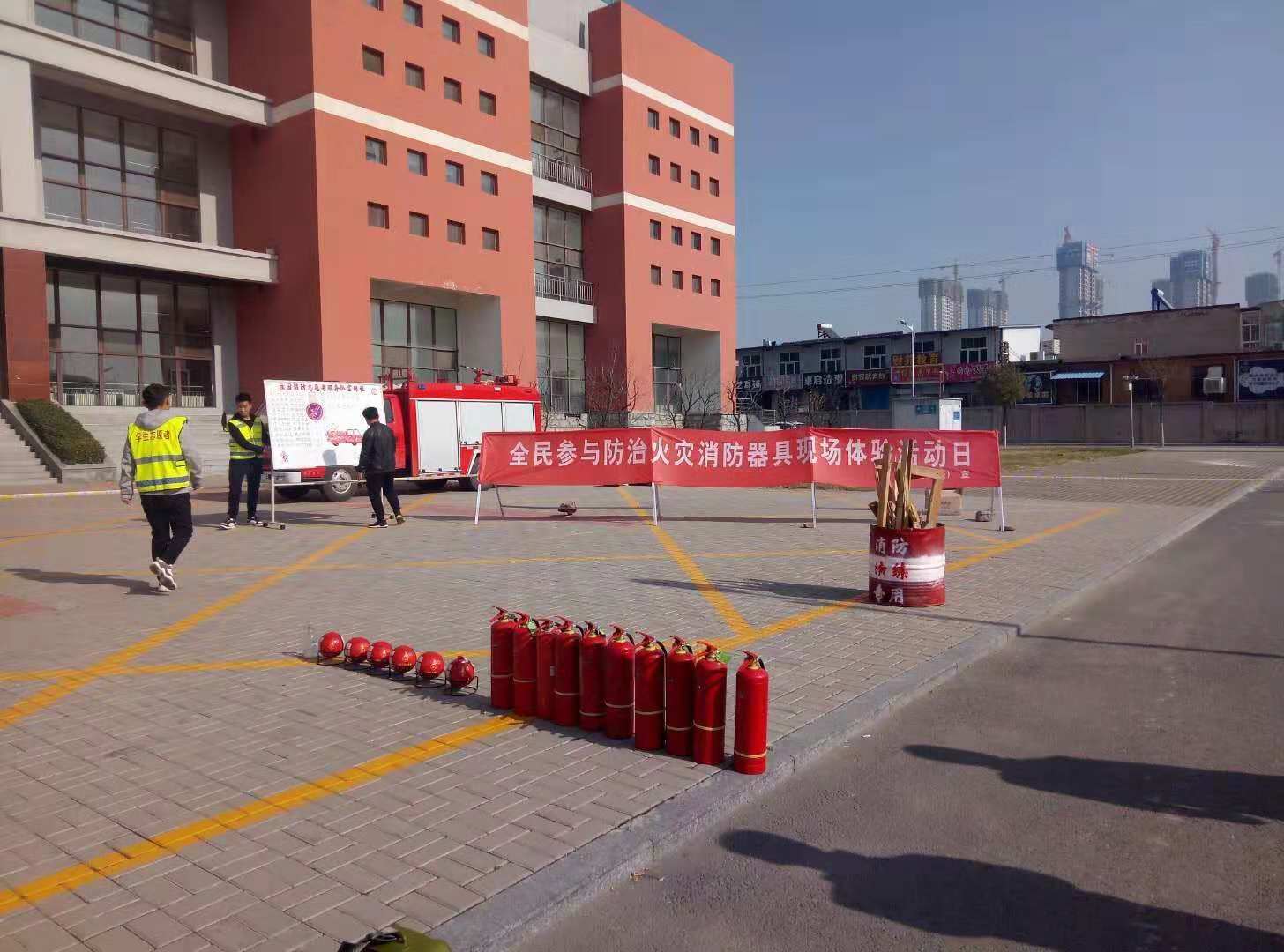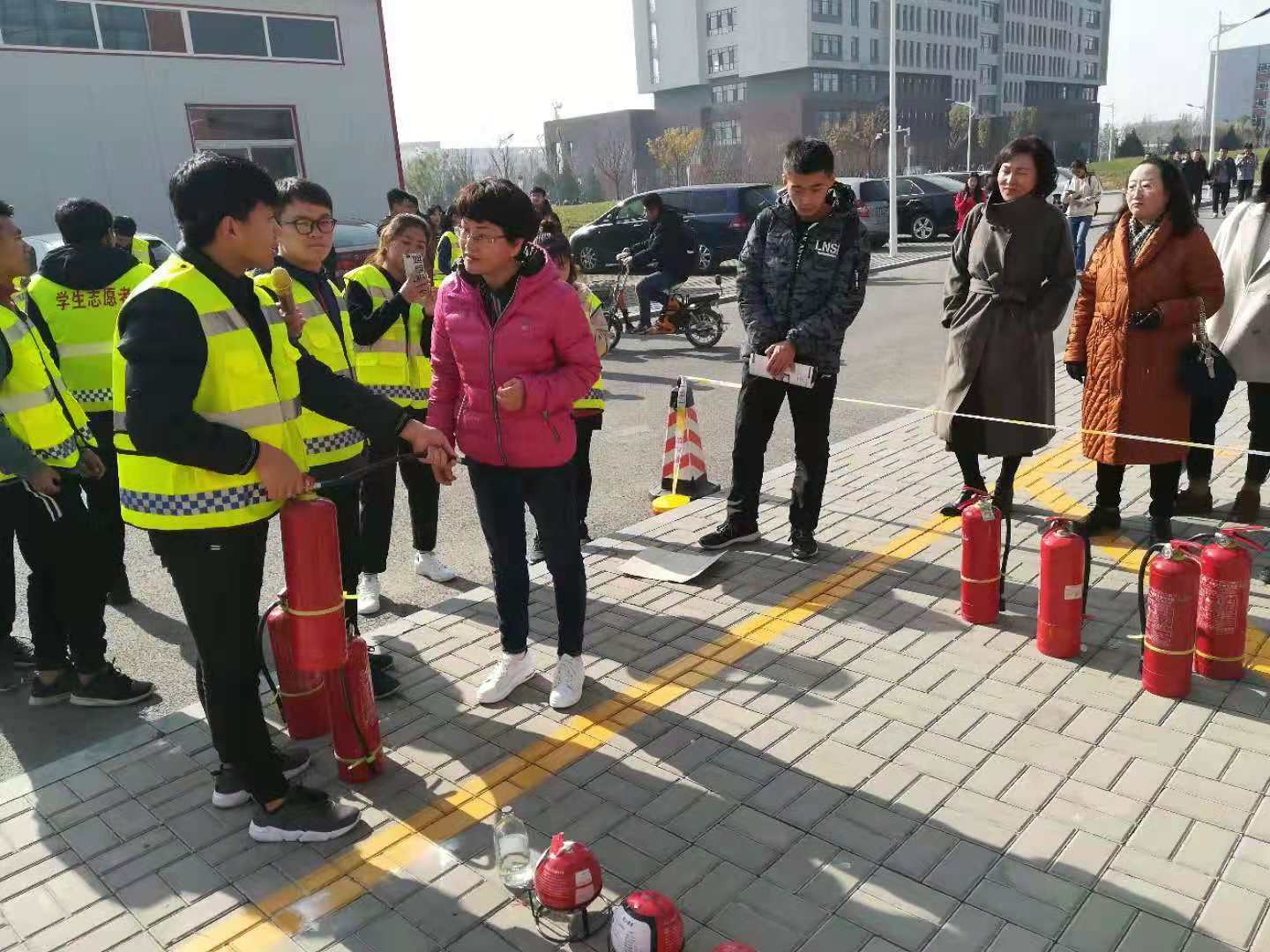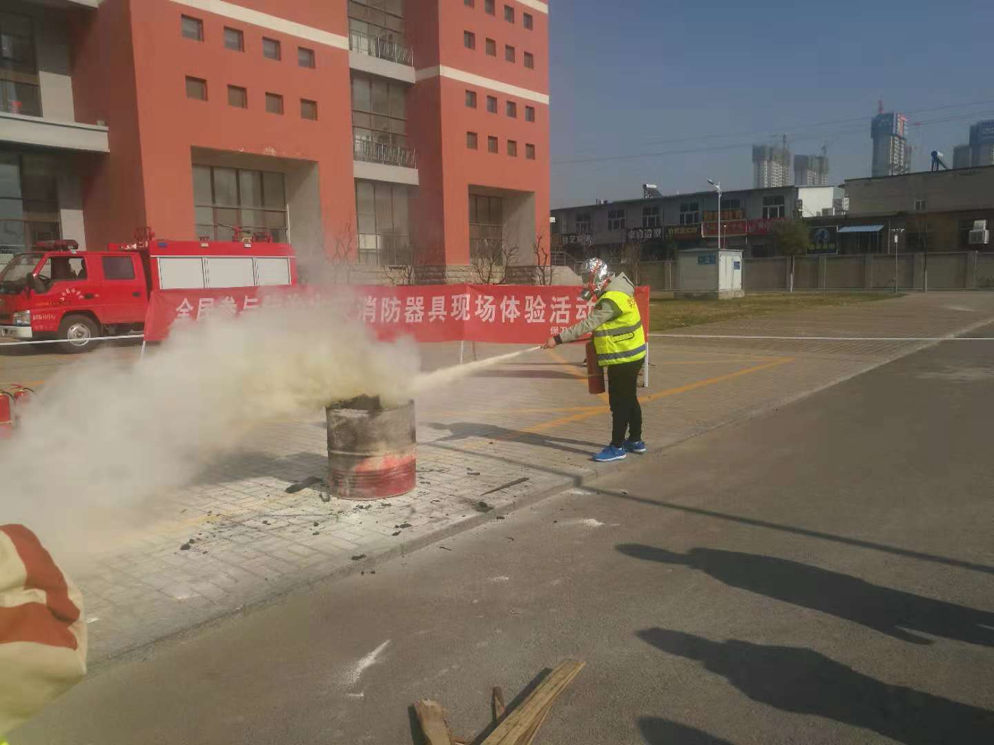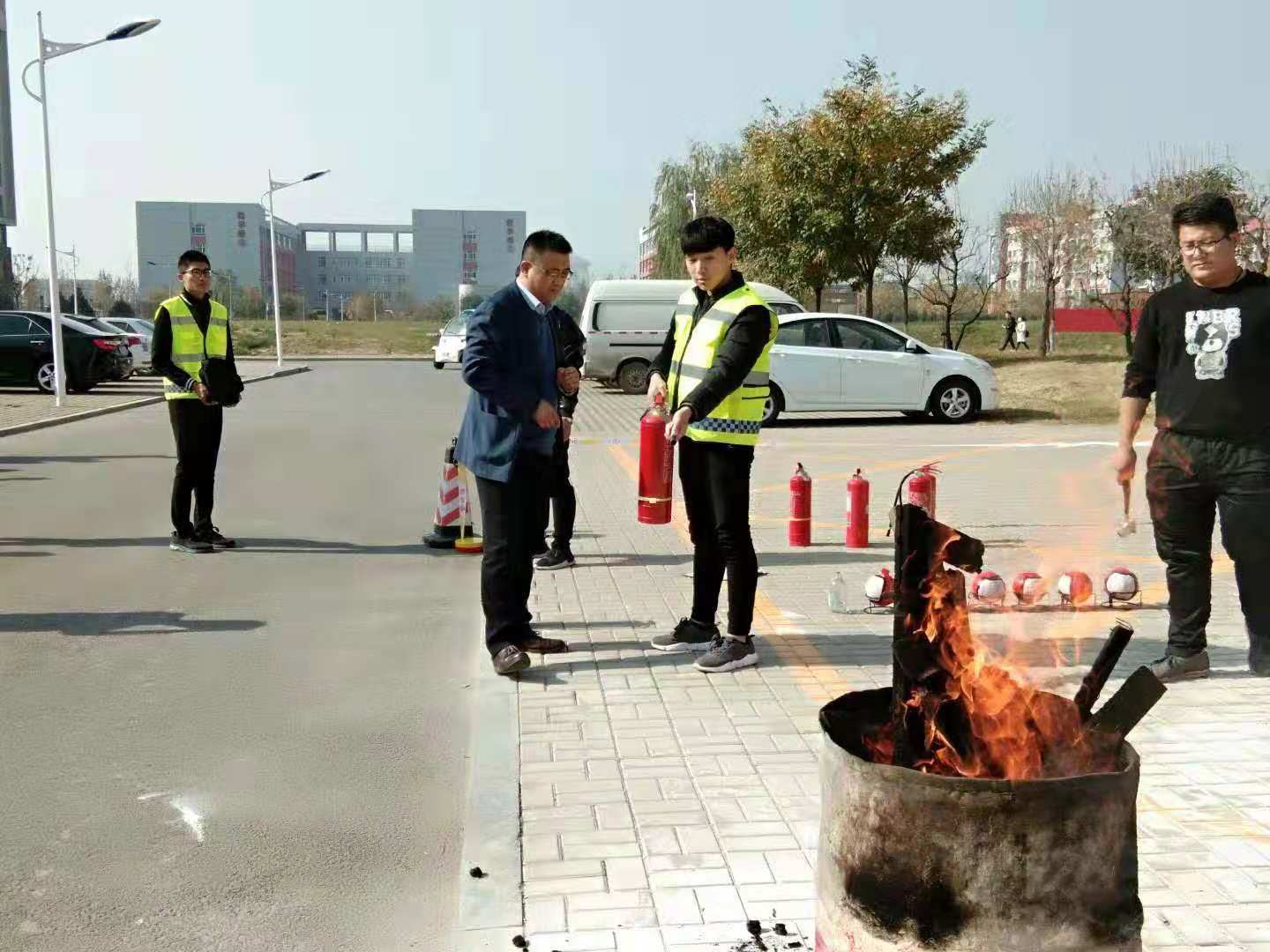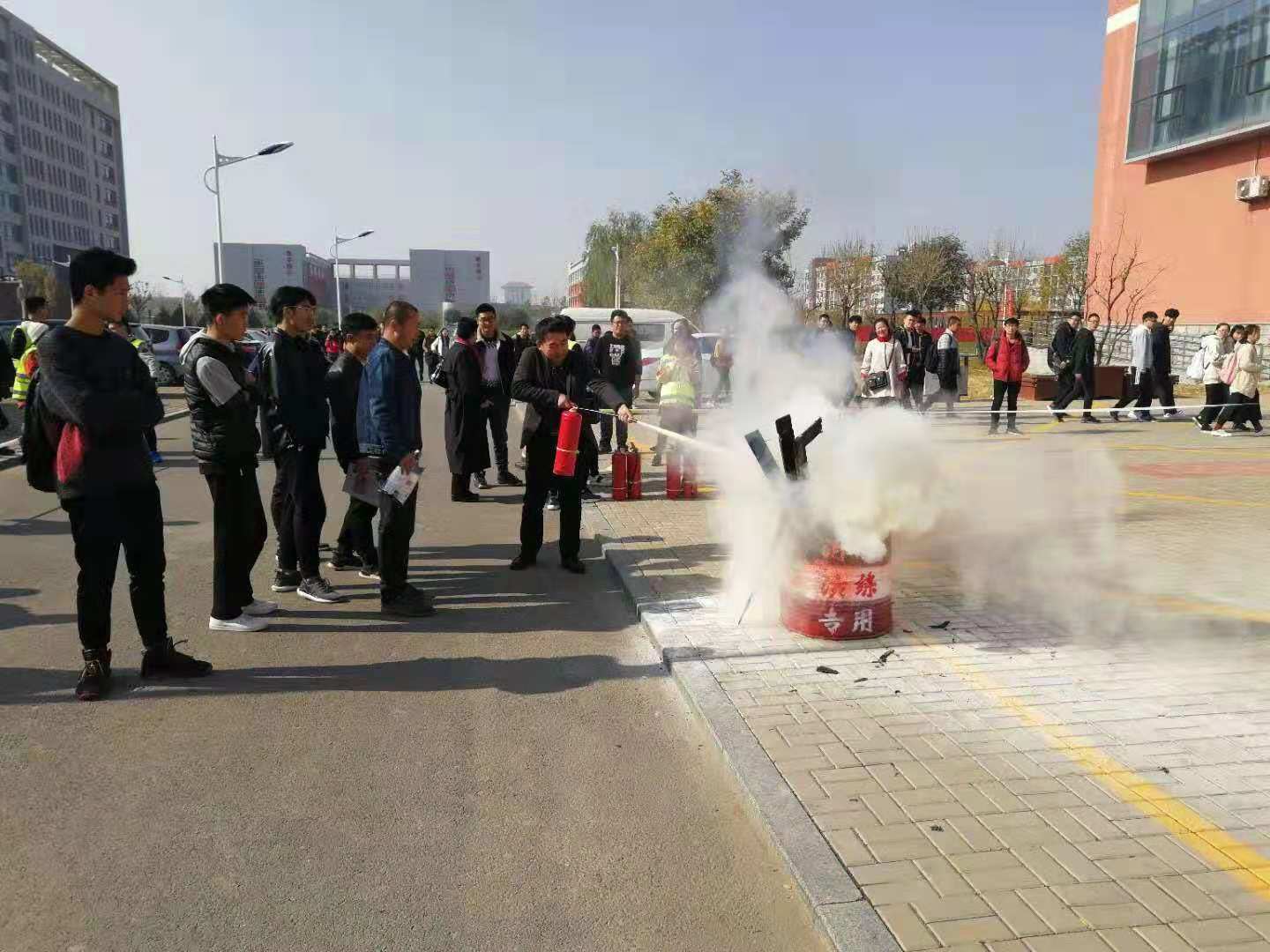 为了保障师生对消防器材、器具的使用体验的安全,提前设置好警戒带,将灭火器、灭火毯、防毒面具、灭火弹全部摆放到位,安排了专门的体验讲解员进行讲解。准备就绪,点燃准备好的演练消防桶,火焰随即熊熊而起。学生们都跃跃欲试积极要求参与体验活动。首先由校园119消防服务队队员演示干粉灭火器的正确使用方法、步骤、以及灭火姿势等,接下来就是同学们的实际操作。随着干粉灭火器的喷射,熊熊烈焰很快被扑灭。参加实际体验灭火过程的同学都能认真按照要求操作,现场气氛十分热烈。接下来还有干粉灭火球的实际体验,随着干粉灭火球投入消防演练桶后,很快产生爆裂,球内干粉在爆裂后四散开来,将桶内火焰扑灭,同学们都对这一新型灭火装置产生了浓厚的兴趣。在整个体验活动的过程中很多教职工和中层干部也主动上前进行了灭火实战操作。院领导均对此次灭火器具的实际操作、体验活动,给予了充分的肯定与赞扬,要求我们加大消防安全宣传的力度和深度,将学院防火工作做扎实、做细,提升每一位师生员工的防火安全意识和防火灭火技能。