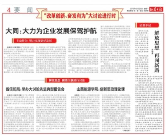 2019年3月25日《山西日报》"改革创新、奋发有为”大讨论进行时专栏报道我院创新思政理论课。