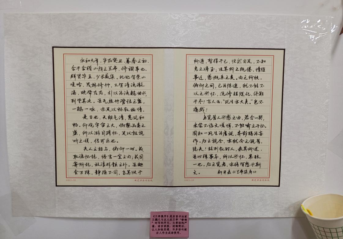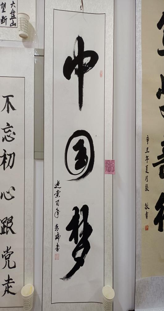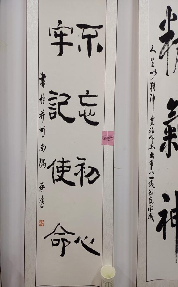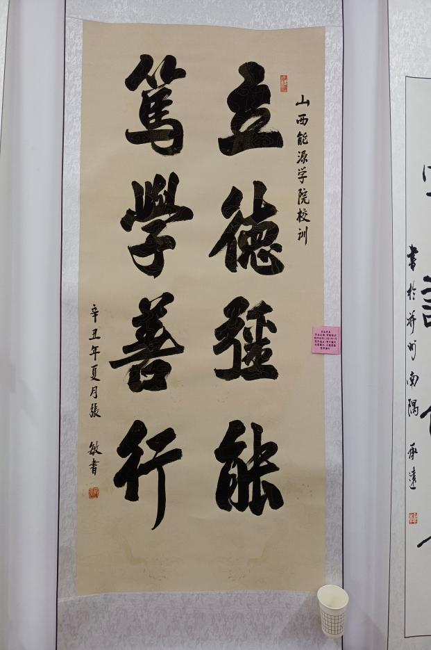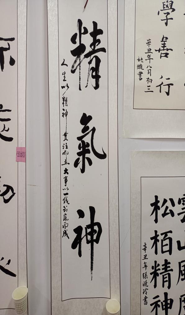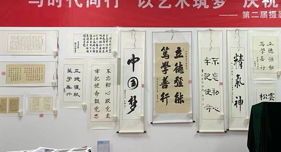 书法作品展区共展出16副作品,本次展品从数量和质量方面比去年都有所提高。书法是民族文化的象征,以汉字为载体,与多种艺术相结合,承载着传统文化和民族精神;书法能够培养人的道德素质、审美能力,书法能提高自身的修养。本次活动在这方面的展出稍显单薄和不足。