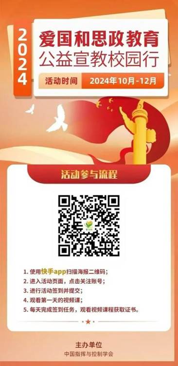 2024国防和思政教育公益宣教校园行”直播活动于202410月至12月期间播出,由中国指挥与控制学会主办,内容涵盖国防教育、爱国主义教育、校园安全及心理健康等课程,专为青年人打造,助力提升综合素养与社会责任感。