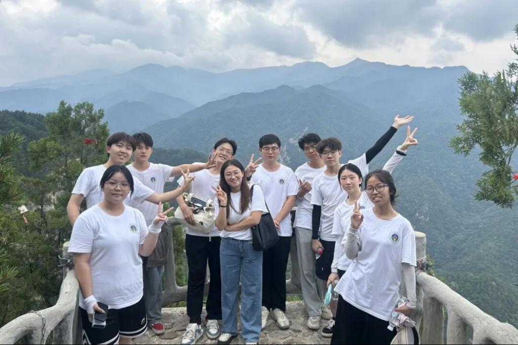 同学们镜头里的崖柏各有姿态:有的被狂风压得贴地,末端却倔强上翘;有的被落石砸出深槽,伤口处反倒抽出更壮的分枝。快门声里,崖柏的模样与队员们专注的身影一同定格。近两小时后全员登顶,云雾翻涌中,群山与崖柏若隐若现。登顶的喜悦混着对崖柏生命力的感慨,更有对舍身崖传说中坚守与顿悟的触动,让这段旅程意义非凡。