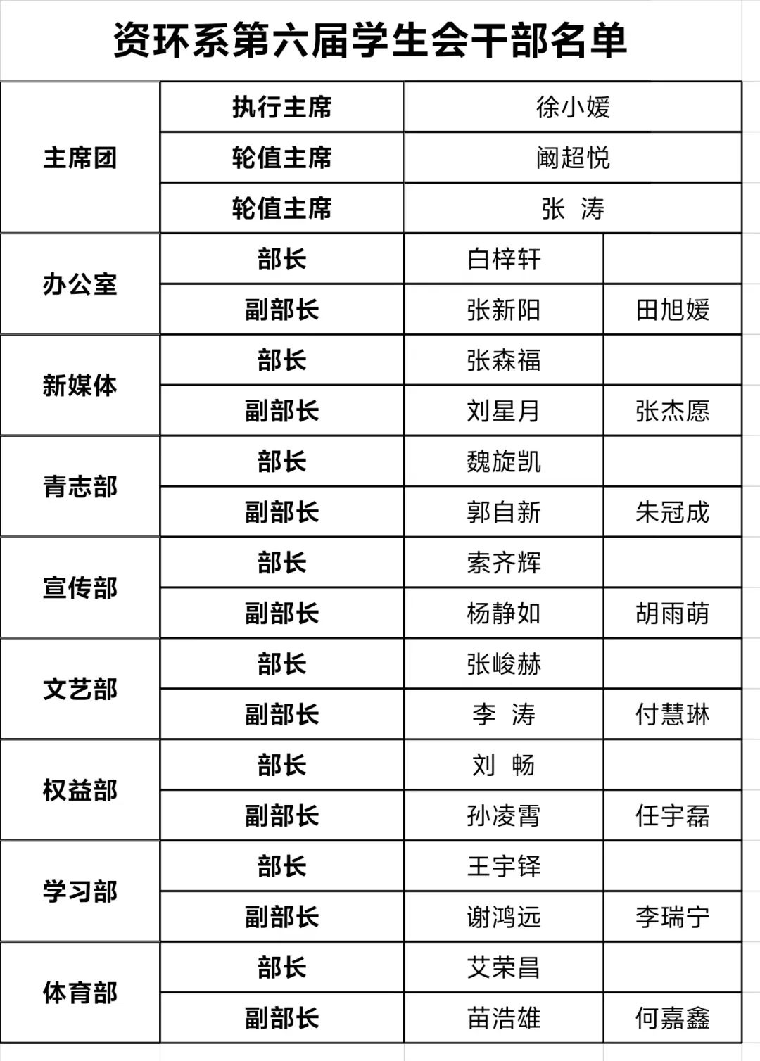 至此,资源与环境工程系学生会换届大会圆满结束,肩上的担子已传到新一届成员手中感谢上一届学生会成员,为系部付出的辛苦努力。换届,变换的是成员,不变的是初心,希望新一届的学生会成员能够继承资环系学生会的优良传统,树立服务意识 发挥积极作用,为个人发展蓄力添彩,为系部发展添砖加瓦。