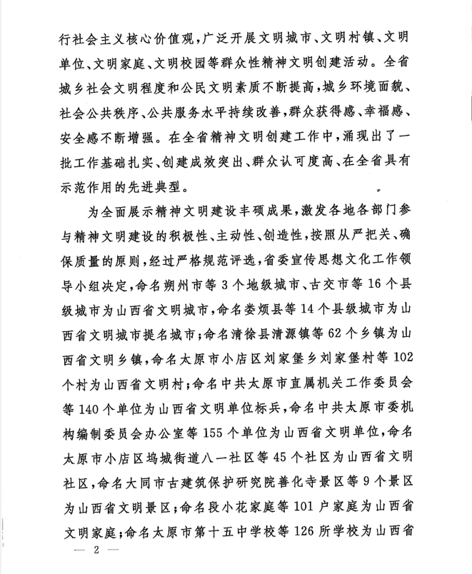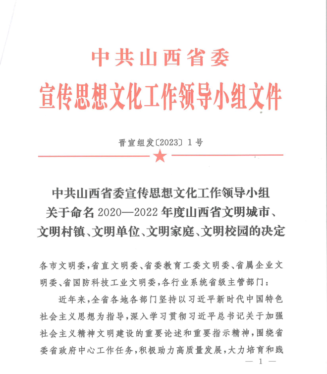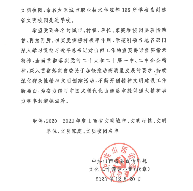 根据中共山西省委宣传思想文化工作领导小组印发的《关于命名2020-2022年度山西省文明城市、文明村镇、文明单位、文明家庭、文明校园的决定》,beat365荣获2020—2022年度“山西省文明校园”称号。