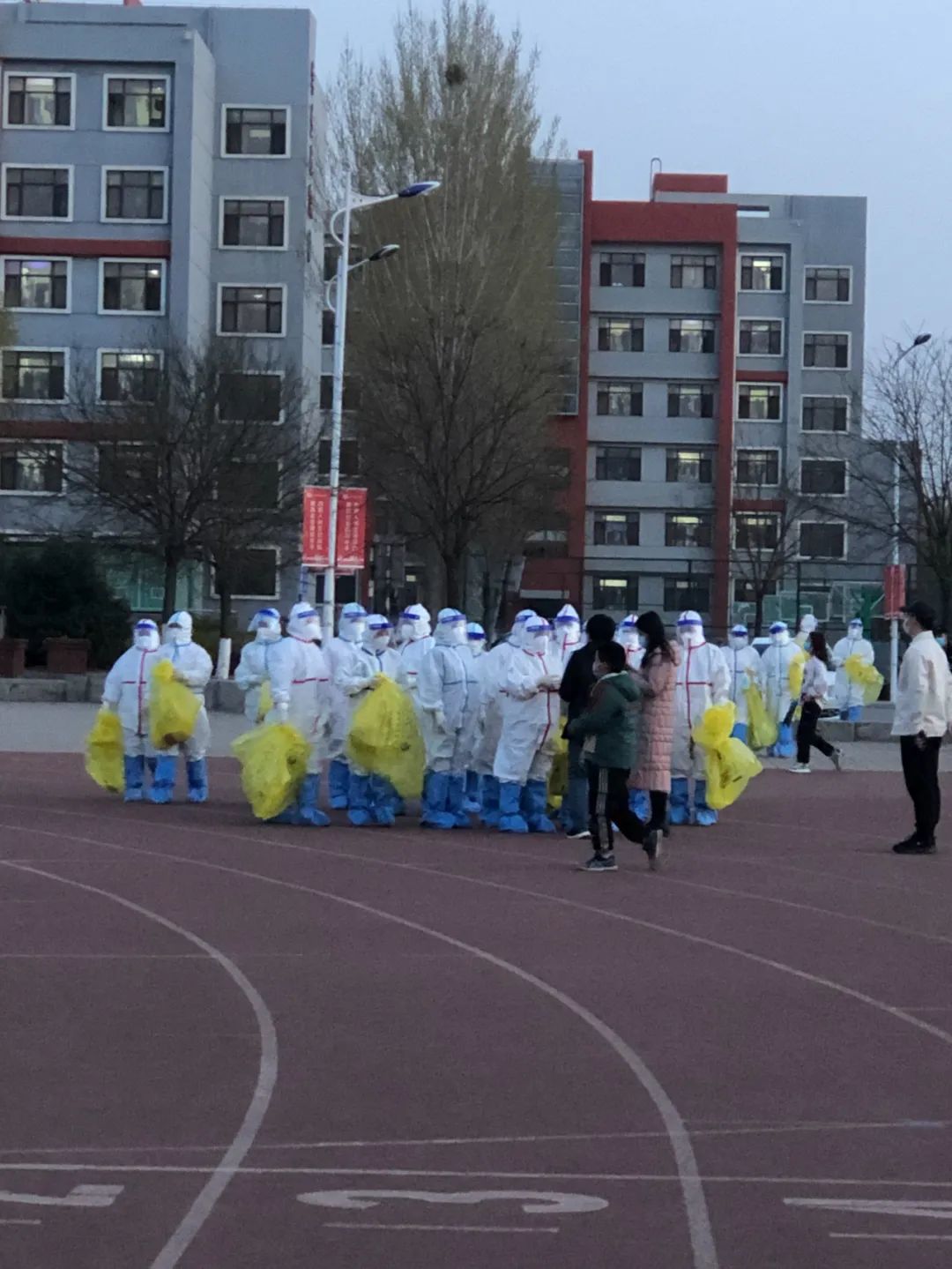 师生自觉佩戴口罩,分组排队检测,即采即走。