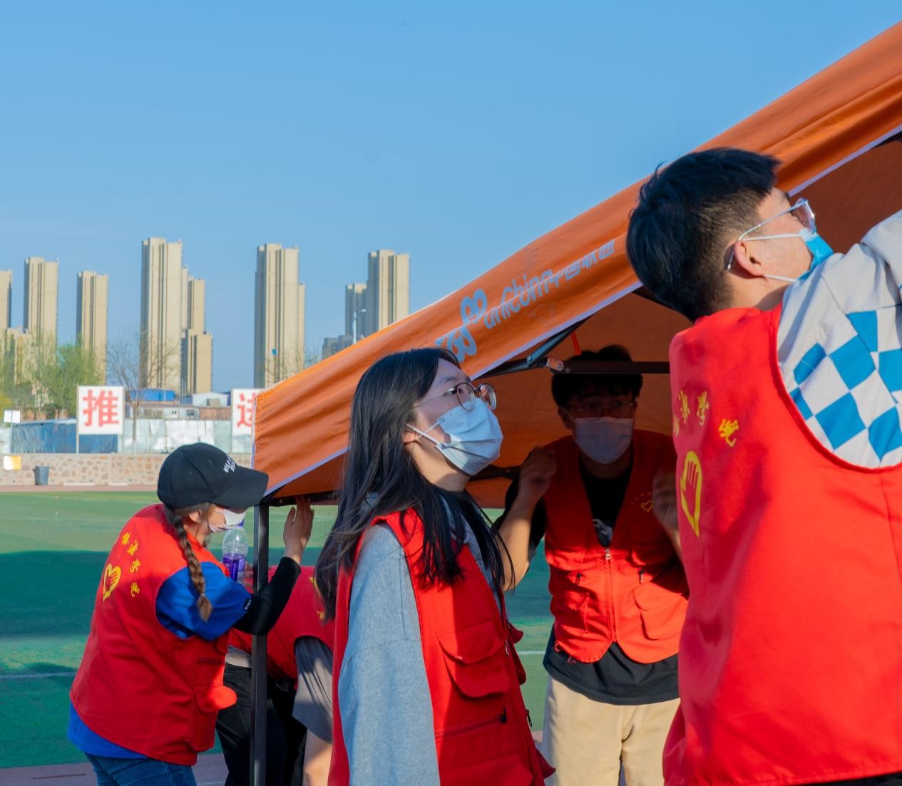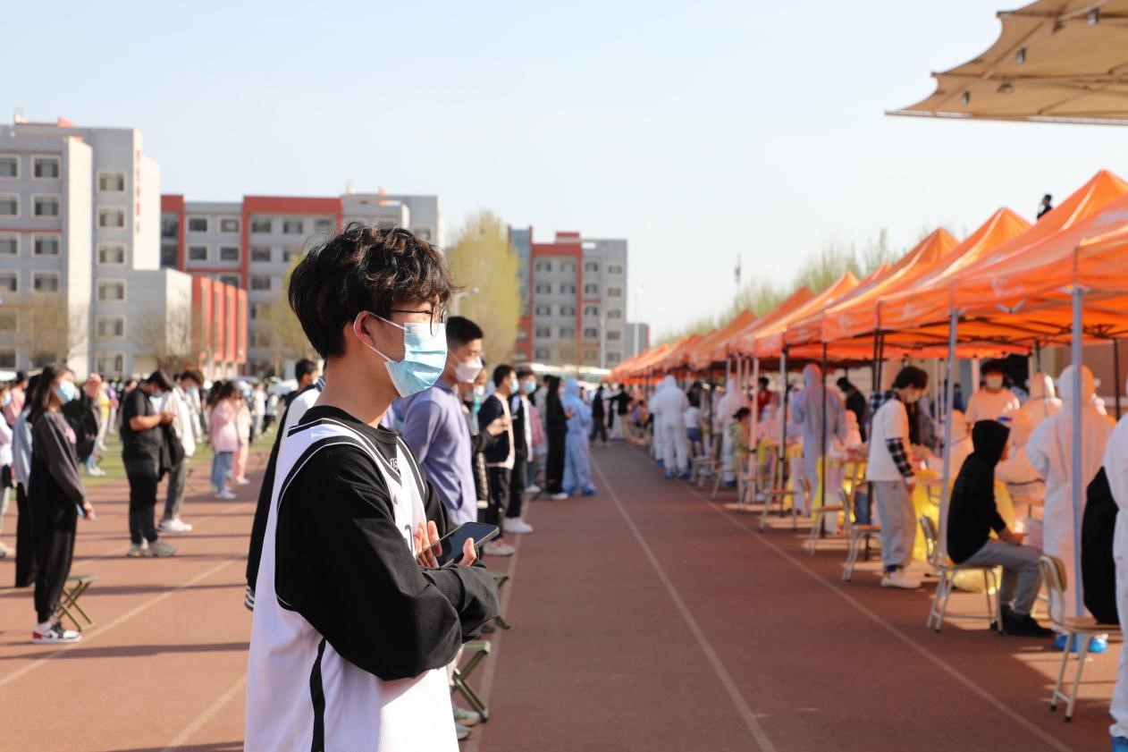 采样现场,值班老师、志愿者维护现场秩序,引导学生及教工人员戴好口罩、有序排队、保持距离。学生及教工人员积极配合工作,自觉佩戴口罩,按照系部分配的检测点分组排队检测,间隔一米,即采即走,秩序井然。