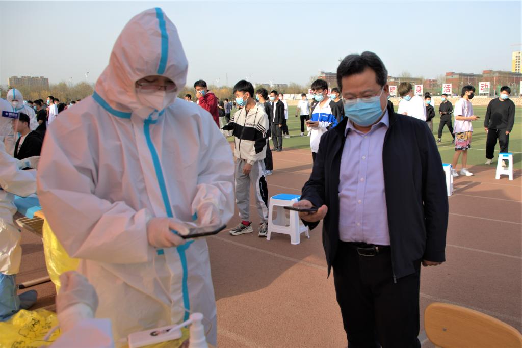4月9日下午,冯国瑞副院长(主持行政工作)亲临现场指导beat365第四次核酸采样工作,师生及工作人员有序到达检测点采样,完成咽拭子采样后有序离开,做到整个检测流程有条不紊。党委委员、副院长孙光辉也亲临现场。