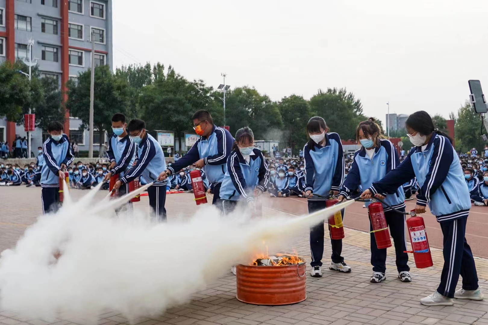 冯锋下达演习开始的命令,一号学生公寓模拟突发火险,警报声响起,只见浓烟瞬间布满公寓,公寓管理人员立即切断电源,打开疏散通道,学生在教官们的指挥下,立即按照从高到低的顺序,依次快速、安全的疏散。同时向校保卫部报警,接到报警后,保卫部立即出动消防车到达火场,展开灭火行动,架设水炮,向起火处喷射灭火。在演习各小组的密切配合下,学生安全疏散,经过清点人数,参加演习学生全部安全疏散撤离。