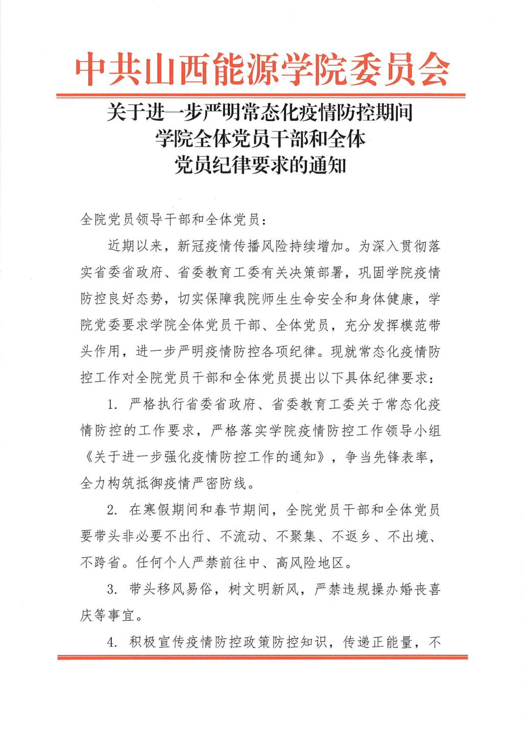 近期以来,新冠疫情传播风险持续增加。为深入贯彻落实省委省政府、省委教育工委有关决策部署,巩固学院疫情防控良好态势,切实保障我院师生生命安全和身体健康,学院党委要求学院全体党员干部、全体党员,充分发挥模范带头作用,进一步严明疫情防控各项纪律。现就常态化疫情防控工作对全院党员干部和全体党员提出以下具体纪律要求: