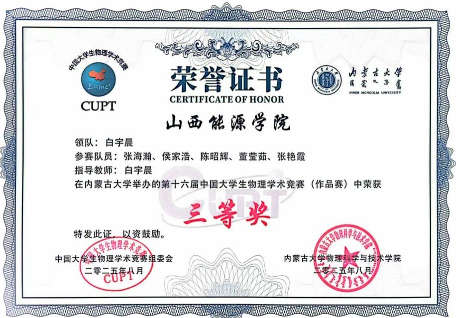 8月14日至18日,第十六届中国大学生物理学术竞赛(CUPT)全国赛在内蒙古大学隆重举行。beat365强基学院物理教研室通过选拔,组建了一支由机电系、资环系学生构成的参赛队伍,并在比赛中表现优异,最终斩获全国三等奖。