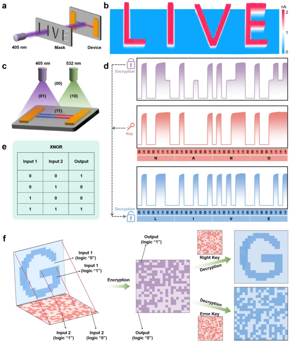 论文利用源移动化学气相沉积系统制备了一种全无机卤化物钙钛矿异质结纳米线。结果表明异质结纳米线光电探测器展现出显著的光电响应、响应度、开关比等方面的性能提升。同时鉴于在可见光波段的高光敏性,CsPbCl3/CsPbI3异质结纳米线光电探测器在图像传感及加密通信领域展现出巨大潜力。如图二所示为基于高性能光电探测器的高分辨率空间图像LIVE”与双通道光加密通信应用研究,有利保障信息的安全传输。该研究工作为研究钙钛矿异质结构中载流子的传输特性提供了材料平台,在新一代高性能集成光子器件中具有潜在的应用价值。同时,以激光作为光信号和数据信息媒介,大幅提升信息的保密性和安全性,对推动光子通信及信息全光处理等领域的发展具有重要意义。