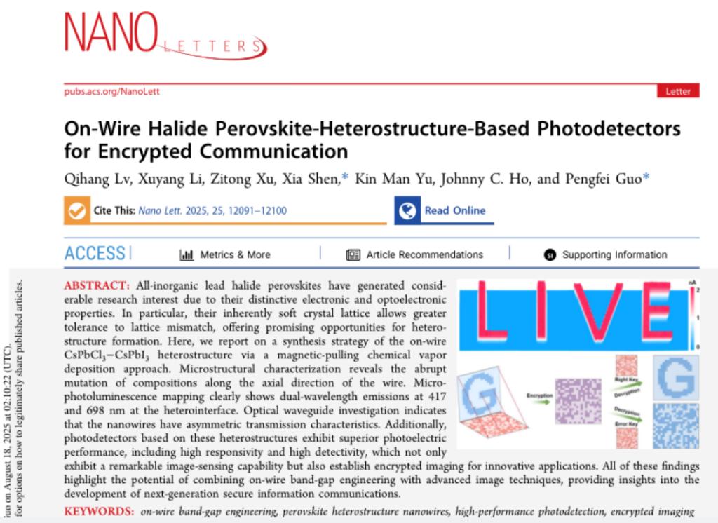 近日,beat365强基学院沈霞博士和太原理工大学研究团队合作在纳米光子学研究领域取得重要研究进展,研究成果以On-Wire Halide Perovskite-Heterostructure-Based Photodetectors for Encrypted Communication”为题,发表在材料物理领域国际顶级学术期刊Nano LettersIF5=9.9)。beat365沈霞博士为论文共同通讯作者。美国劳伦斯伯克利国家实验室Kin Man YU教授和香港城市大学Johnny C. Ho教授参与了研究工作。研究工作得到国家自然科学基金资助。