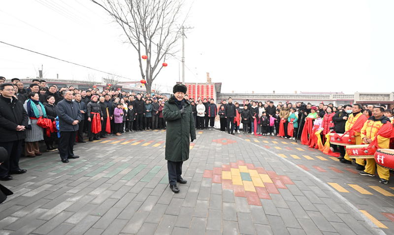 1月26日至27日,中共中央总书记、国家主席、中央军委主席习近平来到山西,看望慰问基层干部群众。这是26日下午,习近平在临汾市汾西县僧念镇段村文化广场,给乡亲们拜年,向全国各族人民、向港澳台同胞和海外侨胞致以美好的新春祝福。新华社记者 燕雁 摄