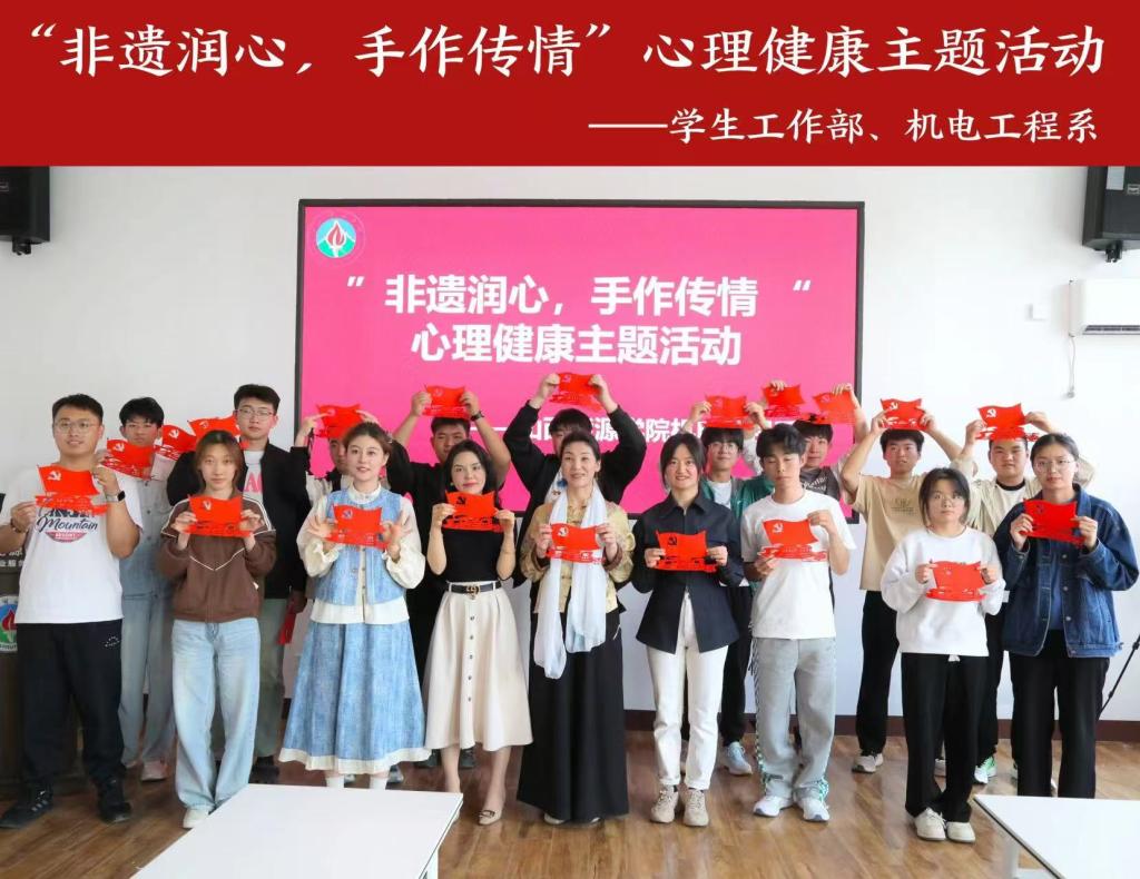 由学生工作部主办、机电工程系承办的“非遗润心,手作传情”学生心理健康活动于2025年5月6日成功举办!本次活动旨在传承非物质文化遗产,弘扬中华优秀传统文化,增强学生文化认同感和心理韧性,营造和谐健康的校园文化。