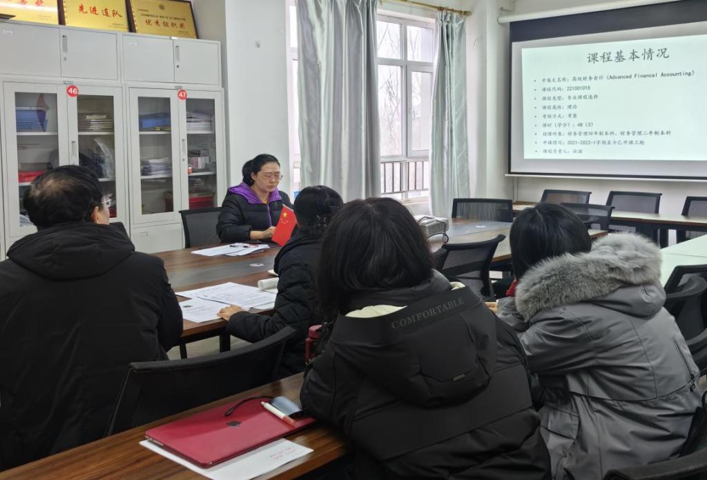 《高级财务会计》课程负责人杜丽老师对所申报的评估课程基本情况及自评得分进行了详细汇报,并向各位评估专家提出了当前教学和评估工作中遇到的问题。评估专家在听取了汇报后,就杜丽老师所提出的问题进行了详细的解答,并对该课程教材的选用、评估资料的整理提出了建设性意见。