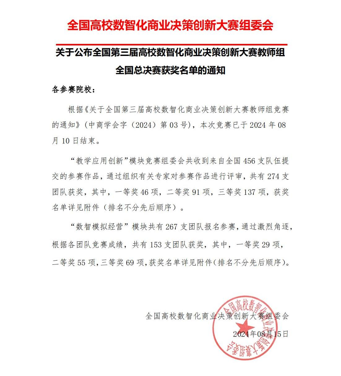 近日,全国第三届高校数智化商业决策创新大赛教师组全国总决赛获奖结果揭晓,我系教师在系副主任(主持行政工作)戴国宝博士的带领下,奋力拼搏,经过激烈的角逐,在来自全国“教学应用创新”模块的456支参赛队伍和“数智模拟经营”模块的267支参赛队伍中脱颖而出,荣获“教学应用创新”模块一等奖2项,二等奖1项,三等奖7项;荣获“数智模拟经营”模块三等奖1项。