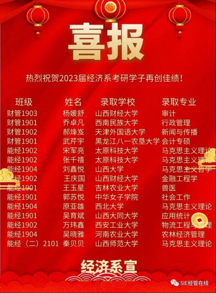 在此,经济系向考研学子表示诚挚的祝贺!也期望有志考研的学子们以他们为榜样,勤奋笃行,务实奋进、不惧困难、续写辉煌!