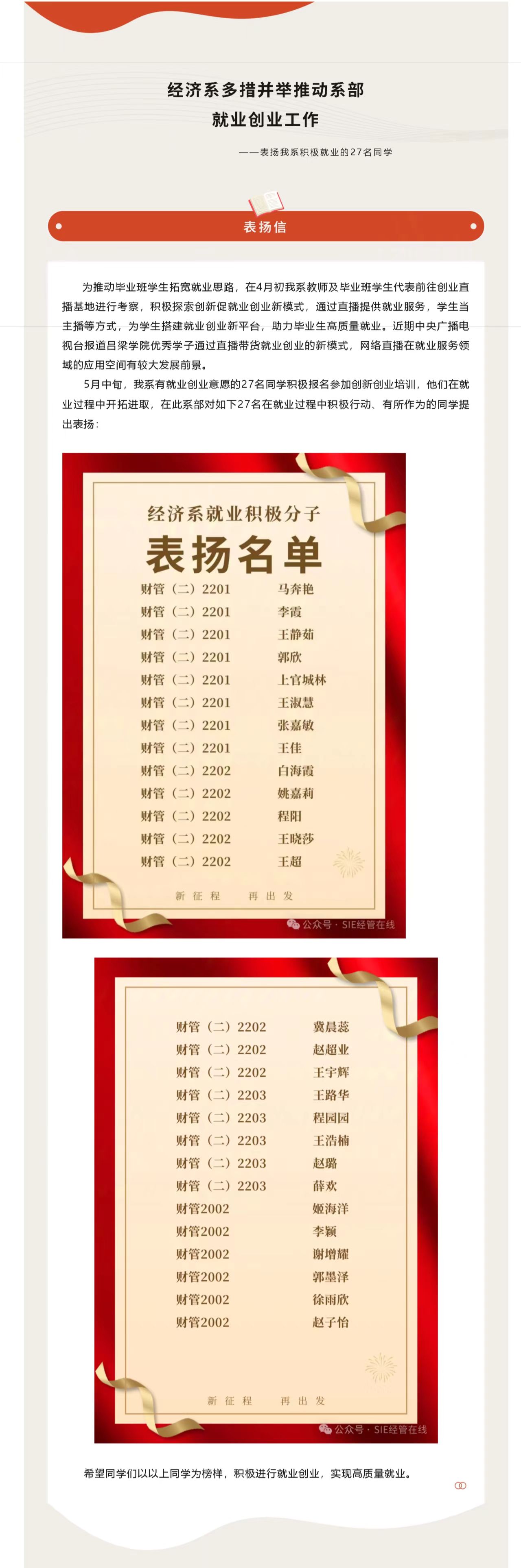 经济系多措并举推动系部就业创业工作——表扬我系积极就业的27名同学