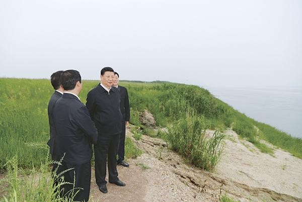 2018年4月26日下午,中共中央总书记、国家主席、中央军委主席习近平在武汉主持召开深入推动长江经济带发展座谈会并发表重要讲话。这是座谈会前,习近平于25日下午在岳阳市君山华龙码头察看非法砂石码头取缔及整治复绿、湿地修复情况。 新华社记者 谢环驰/摄