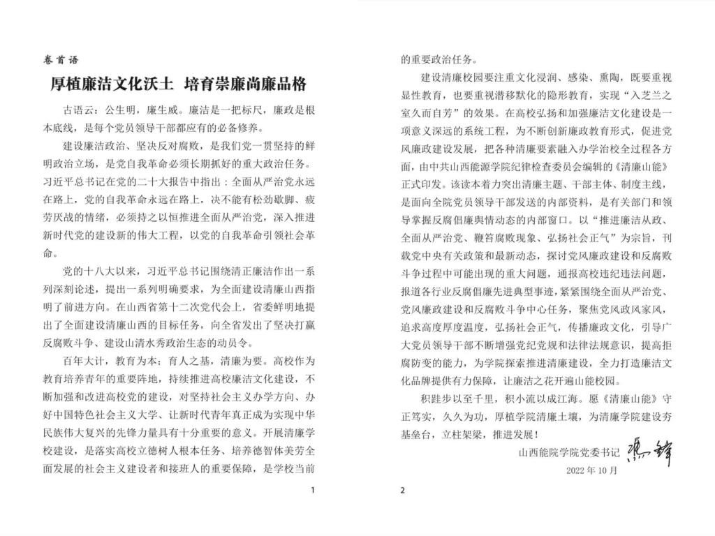 为促进学院党风廉政建设和反腐败工作,把各种清廉要素融入办学治校全过程各方面,近日,学院纪委创新廉政教育形式,编辑印发了《清廉山能》读本。