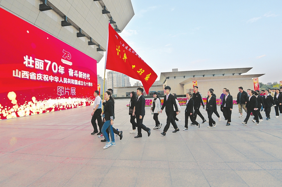 图为参观山西省庆祝中华人民共和国成立70周年图片展的山西建筑职业学院师生们排队进场。记者 李联军 摄
