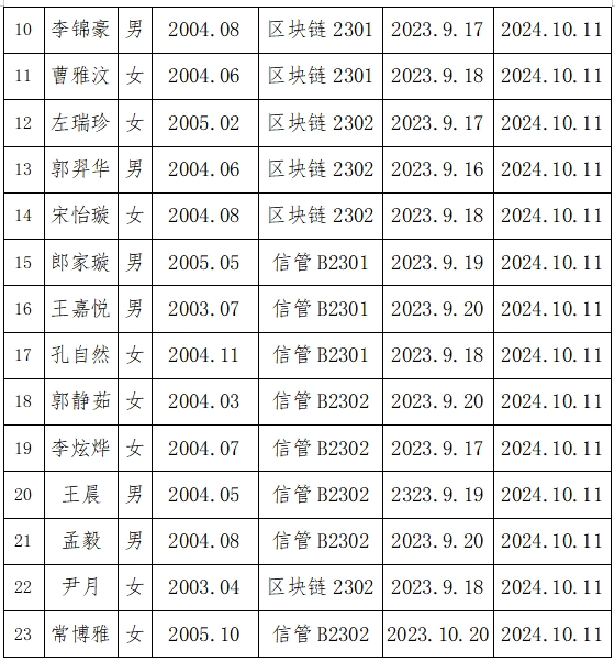 按照《山西省高等学校发展学生党员工作实施细则》要求,根据群团组织推优情况,经计算机与信息工程系学生党支部大会研究讨论,拟确定李怡慧、陈春伟等23名共青团员为积极分子。现对拟确定的入党积极分子基本情况予以公示,公示期为5个工作日,自2024年10月12日—2024年10月17日。