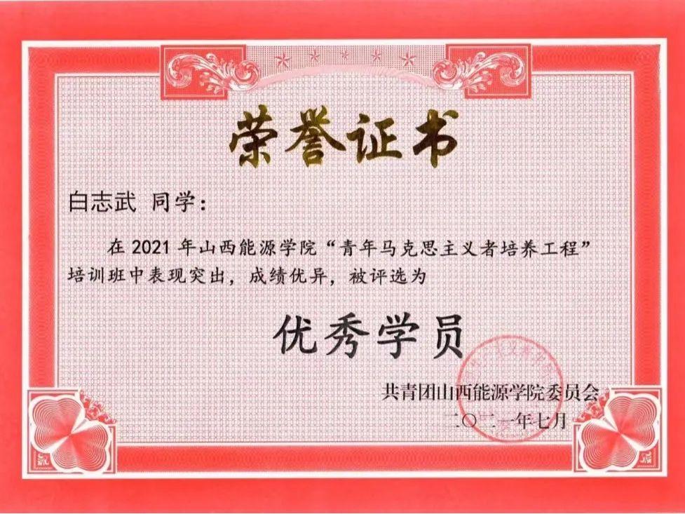 白志武自入学开始就积极向党组织靠拢,提交入党申请书,努力学习贯彻习近平新时代中国特色社会主义思想,积极践行社会主义核心价值观。2022年11月26日,他成为年级第一批预备党员。作为班级班长兼团支部副书记,他带领班级同学关心时事政治,学习党的思想、方针、政策,积极开展多种形式丰富的主题班会和团日活动,他多次参加“青马工程”培训,是一名忠实的大学生青年马克思主义者,并被评选为优秀“青马工程”学员和优秀共青团团员。他说“做一个传递正能量的人”是他一生的信仰。