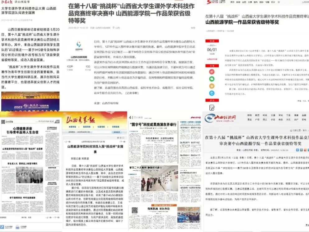 (二)2022年,他作为识别境外改号来电智能系统的项目负责人,深知责任重大,与团队伙伴拨打了无数次模拟电话,一起查看日志,收集通话中IMS信令的SIP协议字段特征差异,创新性地采用基于5G通信协议、前后端分离的部署模式,提出了在终端侧实施基于Log的信令监测,这一技术的发展成熟将给我国通讯行业的安全保障带来新的生机,也可以成为我国外交的一大技术优势,为用户提供全网保护。最终,项目被列入 2022 年大学生创新创业训练计划项目省级立项名单(现已结项),取得了大学生计算机应用大赛全国二等奖、“挑战杯”全国大学生课外学术科技作品竞赛省级特等奖的好成绩,同时被山西日报、山西青年报、山西经济日报、山西科技新闻网等数家媒体采访登报。