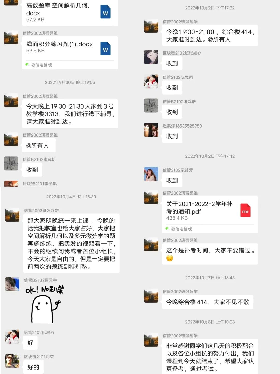 强超雄始终认为自己对知识的深层次挖掘不够充分,还需要不断学习,正是这份谦虚和努力,支持着强超雄在其一对多帮扶的路上行稳致远,奔赴似海前程。在一对多帮扶过程中,强超雄深入了解了受帮扶同学的知识掌握情况,对知识的盲点和难点进行了耐心解答。