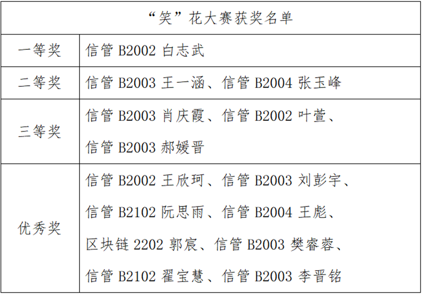 “笑”花大赛需要参赛的同学先提交报名表,然后通过拍照的方式记录学习和生活中遇见的瞬间微笑的照片,最后提交作品。经过评委打分,最终评出一等奖一名、二等奖两名、三等奖三名,优秀奖若干。