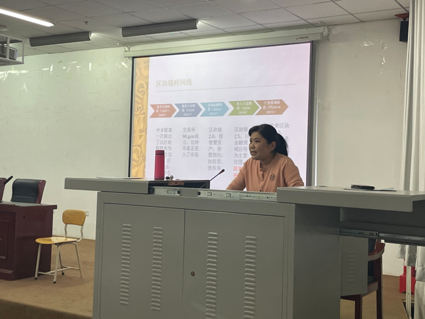 讲座由周云飞副主任主持,他介绍了郭教授的个人情况及学术成就,并代表计算机与信息工程系向郭教授的到来表示热烈欢迎。周副主任介绍了区块链产业迅猛发展,从加密货币逐步走向全社会多场景应用,区块链技术在推动一个时代前进中发挥着不可忽视的主导作用。参加本次讲座的有计算机系党总支副书记闫斐,教科办主任安政,科研秘书薛芳芳,专任教师王建宏、郝霖、吴华、郭琦、袁若兰、蔚晨月,以及2021、2022、2023级在校学生。